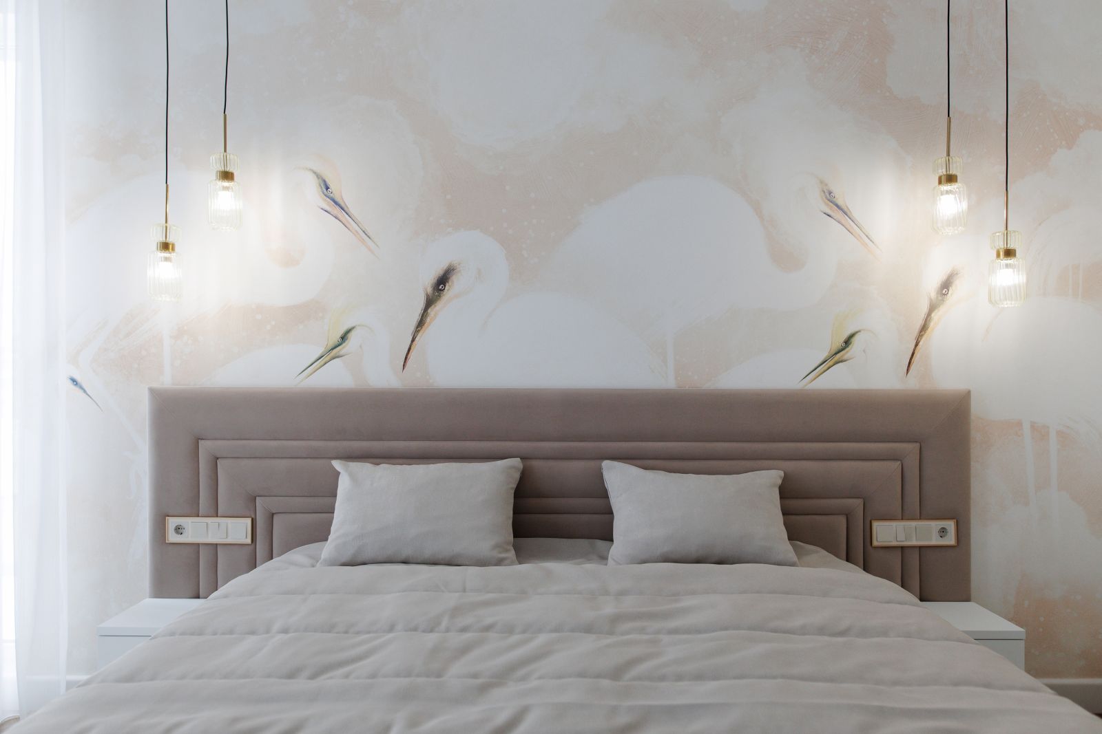 Если вы в поиске вдохновения для оформления спальни и обожаете добавлять в интерьер природные нотки,  тогда этот пример от нашего клиента Досановой Дании точно для вас! Посмотрите, как эффектно она преобразила ТВ-зону и стену за изголовьем кровати, выбрав ECO фреску «Бархат» с изображением изящных цапель (Арт. 34683) из нашей дизайнерской коллекции «Animality»!