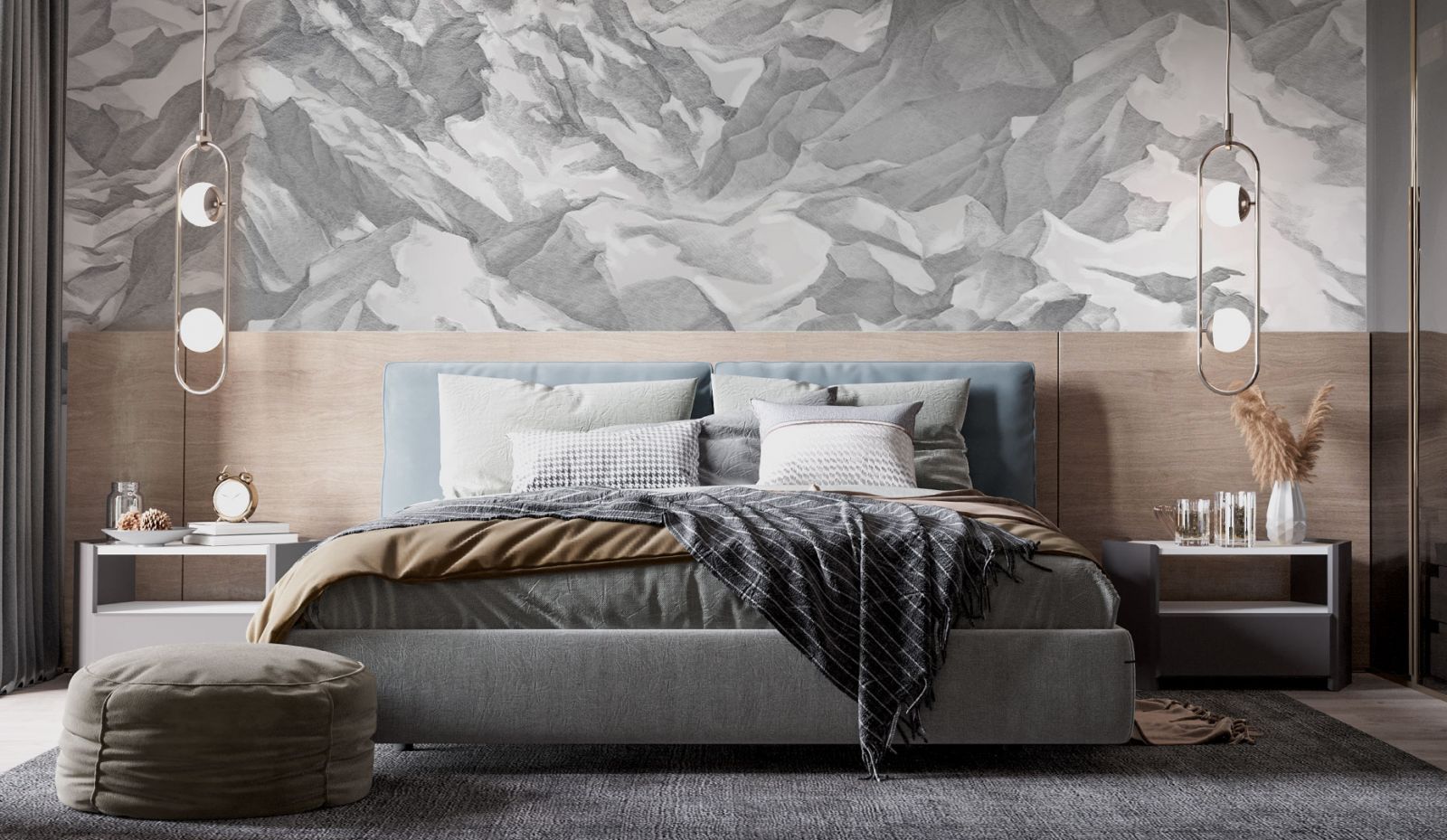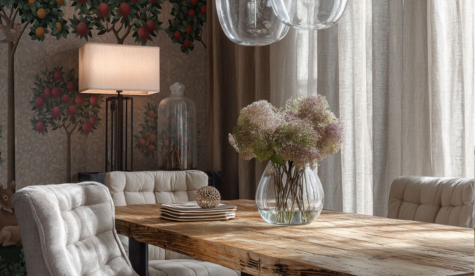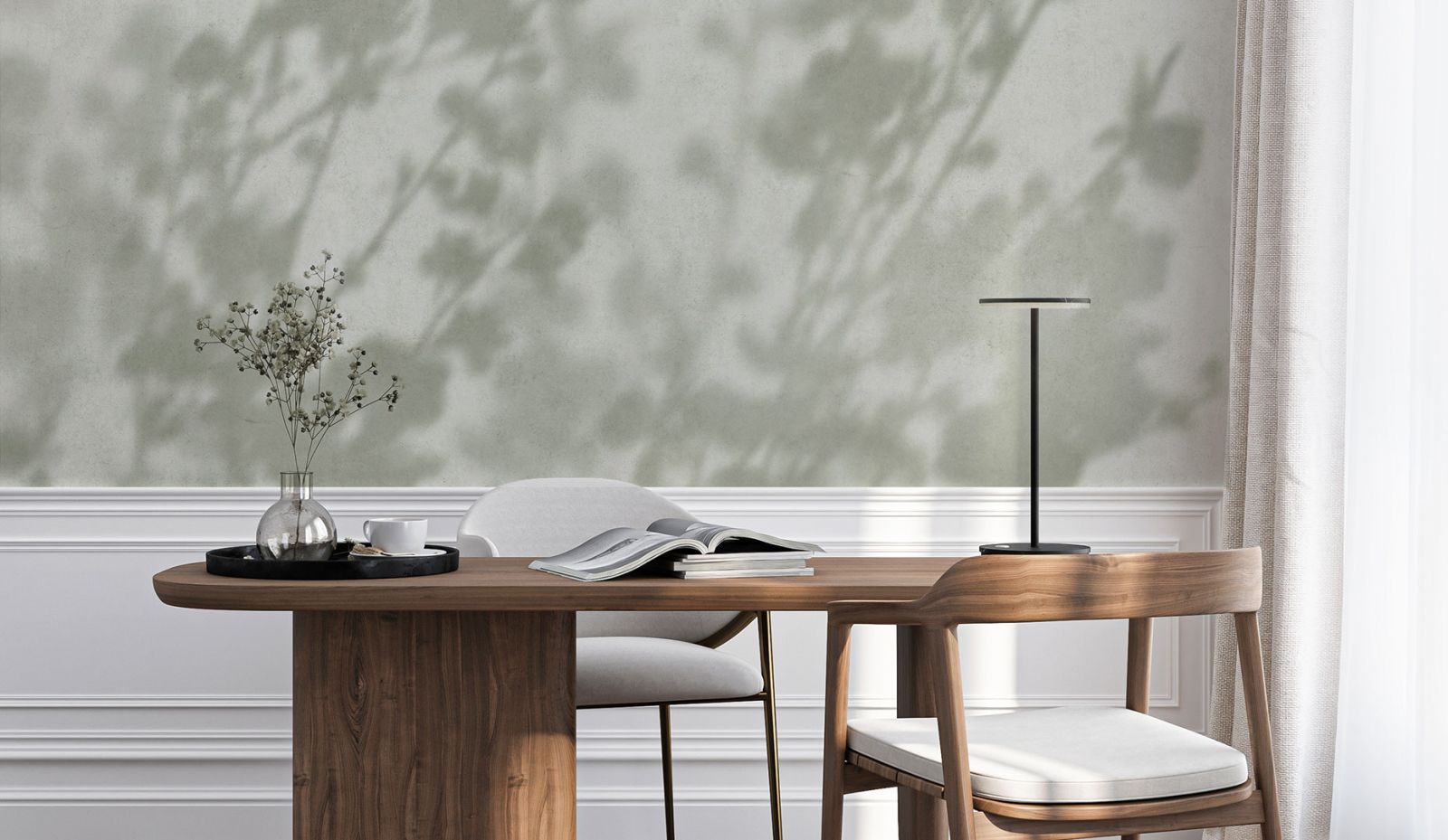 Как правило, стены в переходном стиле являются лёгким ненавязчивым фоном. Из материалов предпочтение отдаётся фактурной штукатурке, декоративному кирпичу с эффектом натуральной кладки, деревянным панелям. Чтобы привнести ту самую индивидуальность и изюминку в переходный интерьер, отличным выбором станут обои с лёгким ненавязчивым сюжетом. Гармоничные цветовые вариации, дизайнерские сюжеты на любую тематику (будь то классические узоры и вензеля или та же имитация природных текстур) позволят создать оригинальный акцент на определённой зоне вашего пространства, наполнят его смыслом и оригинальностью. К тому же, они максимально экологичны, подходят для размещения в спальнях и детских комнатах.