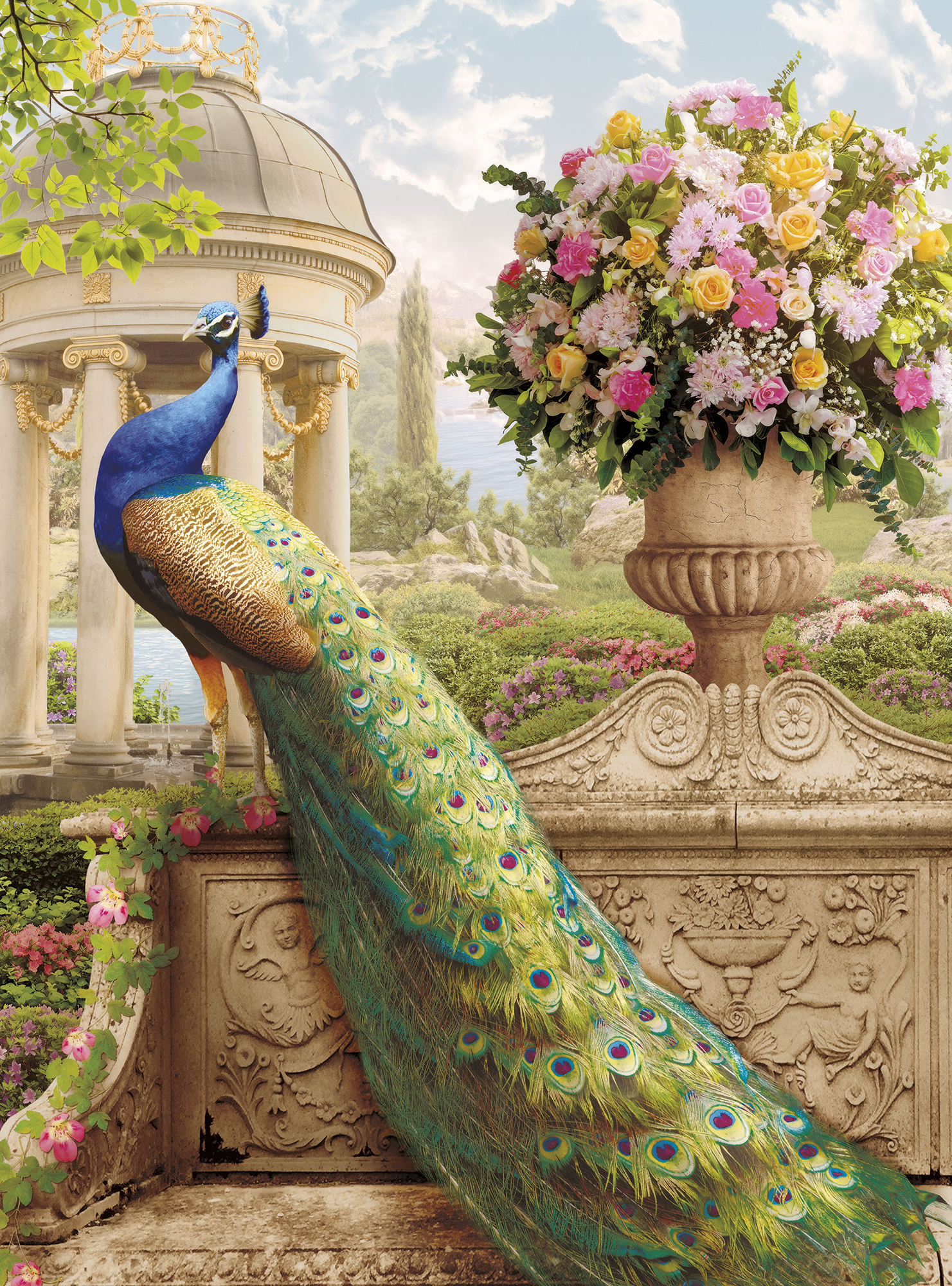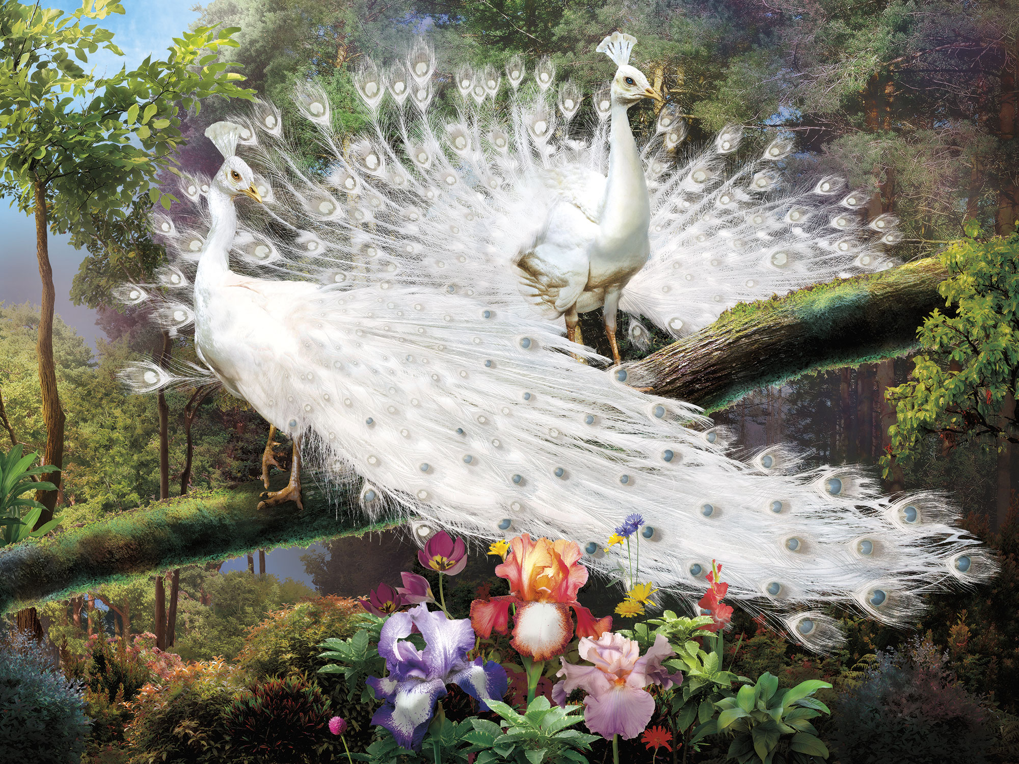 Павлин и белые цветы